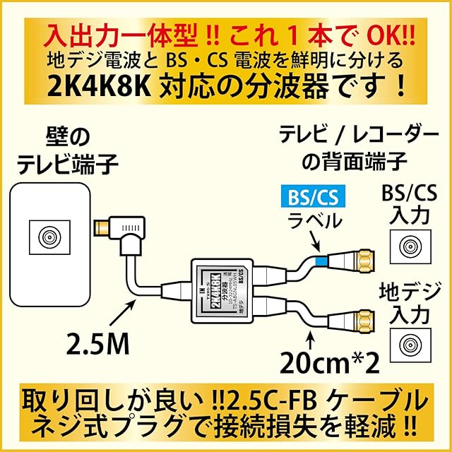 4K8K対応!地デジ(地上デジタル)アンテナとBS・CSアンテナの混合器、ブースターなどで混合した電波をテレビやレコーダーに接続する際に分波(地デジとBS・CS)の電波に分けるための2K・4K・8K対応の分波器(セパレータ)です。従来の2K放送、CATVでも使用できます。