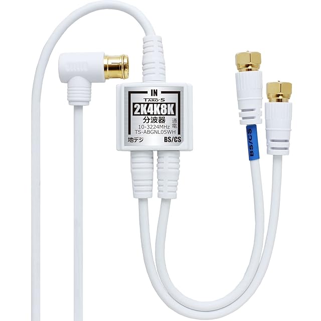 商品名:TARO'S アンテナ分波器 入力/出力一体型ケーブル付き 4K8K放送(3224MHz)/BS/CS/地デジ/CATV 対応 2.5C-FBケーブル 2.5M + 20cm*2 金メッキ ホワイト 小型ボディ タローズ TS-ABGNL05WH