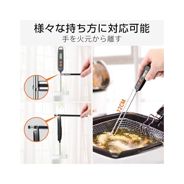 【安全で操作簡単】12 cmの長いプローブにより、測定時に手を熱源から遠ざけて火傷を避けることができます。また、付属のキャップでデジタル温度計をクリップして使うことも可能です。接触型温度計として、プローブ部は食品用レベルのステンレス鋼を採用し、安全な食品調理ができます。デジタル料理用温度計本体は複雑な設計がなく、シンプルで使いやすいです。初心者でもすぐに使い始められます。