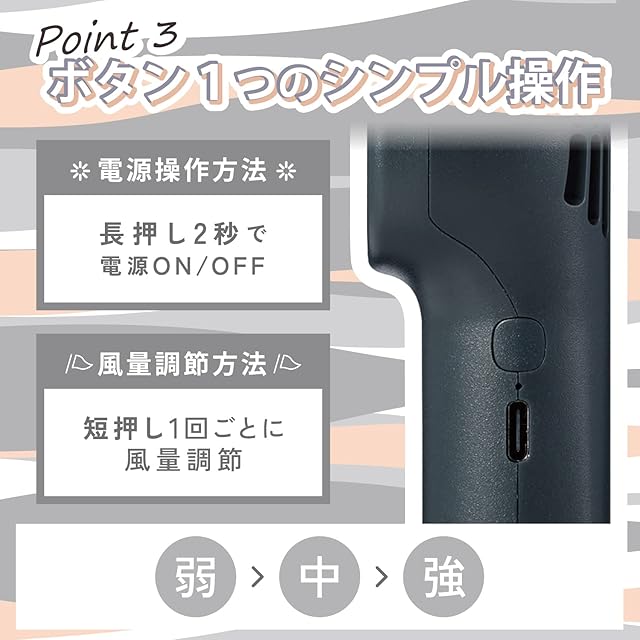 好みに合わせて3段階(弱・中・強)の風量調節ができます。