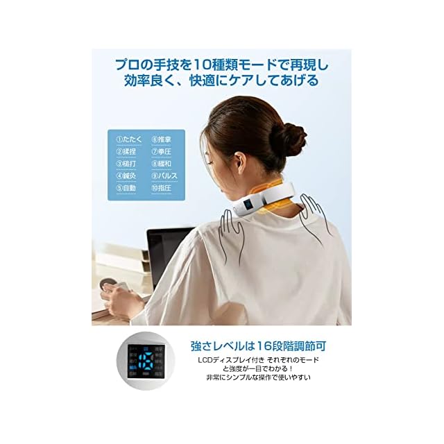 商品名:ネックケア 首 リラクゼーション器 Liaolee 新登場 (加温×EMS&TENSのW効果) 静音 軽量 首元リフレッシュ ネックリラックス ホットケア USB充電式 コードレス 10種類のモード 16段階の強度調整 液晶ディスプレイ 日本語音声ガイダンス 簡単操作 父の日 母の日 記念日 誕生日プレゼント お祝い 男女兼用 日本語説明書を同梱