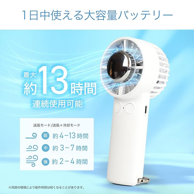 冷却プレートを肌に直接あてて瞬間クールダウン!最大13時間使えるシンプルデザインの3WAYハンディファンが登場!! 人混みの中でも気になりにくい3段階の風量調整が可能。ボタン1つで切り替えができる簡単操作。送風時に冷却プレートも併せて使うことで夏の暑い屋外でも瞬間的に身体を冷やすことができます。 また、4,000mAhの大容量バッテリーを搭載しているため、一日中(最大13時間)バッテリーの残量を気にすることなく涼むことができます。万が一、バッテリー残量が少なくなった時には、お手持ちのモバイルバッテリーに繋ぎなら使えます。 その他、カラビナフックが付いているため、バッグに付けて携行したり、フック部分を倒すことでオフィスや自宅でも卓上ファンとして使用できます。 【製品仕様】 ■運転時間:弱(約4~13時間) / 中(約3~7時間) / 強(約2~4時間) ■材質:ABS / PP / 亜鉛合金 / シリコン ■製品サイズ: W約69mm x D約72mm x H約190mm ■パッケージサイズ:W約98mm x H約195mm x D約80mm(フック部分含まず) ■重量:約250g ■パッケージ込み重量:約350g ■入力:5V / 2A ■定格電力:6W ■バッテリー容量:4,000mAh ■充電時間:約4時間 ■生産国:中国 ■期間:ご購入より6ヶ月間 【注意事項】 ※充電の際は、必ず付属の充電ケーブルを使用してください。他のケーブルを使用すると、充電ができない場合や故障する恐れがあります。 ※金属部分が直接肌に触れますので、金属アレルギーの方やその恐れのある方はご使用にならないでください。 ※製品仕様およびパッケージは改善のため、予告なく変更になることがあります。 ※その他、次のような方は使用しないでください。 ・循環器系疾患のある方(高血圧・低血圧・糖尿病・狭心症など) ・自ら意思表示ができない方、機器操作ができない方 ・妊娠中または妊娠している可能性のある方(医師にご相談ください) ・皮膚の弱い方やアレルギー体質、肌に湿疹や傷のある方 ・体調不良や身体に異常を感じている方 ※子供だけで使用させたり、幼児の手の届くところで使用しないでください。 ※故障の原因となりますので、雨天時に屋外で使用しないでください。 ※髪の毛の巻き込みにご注意ください。 ※接続機器の供給能力により、充電時間は変化します。 ※動作時間は周囲の環境により短くなることがあります。 ※本製品の期間はご購入日より6ヶ月間となります。期間内の故障に限り交換対応いたします。