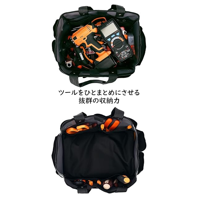 「使用上にご注意」 バッグの中身が散らかった工具がぶつかり合ったりしやすいので、どの工具を優先的に利用するのかを予め決めておく必要があります。工具は入れていない場合は、バッグは自立させることはできません。手提げのみの使用をおすすめです、トートバッグのように手提げバンドを肩掛けの持ち方には不向きです。