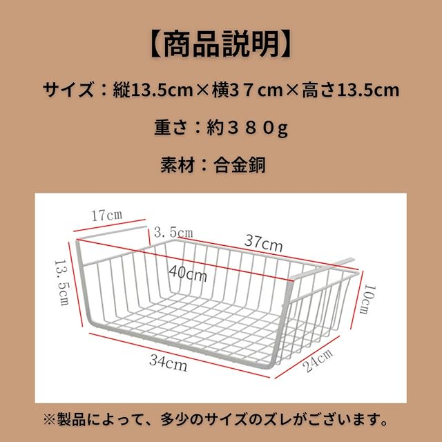 【デッドスペースの有効活用】食器棚の下や机、本棚、洗面台など、棚板があれば、どこにでも取り付けることができます。もう少し収納があれば便利なのに!という時にとても役立ちます。 【多目的・機能的】すぐに使うタオルは引き出しに入れるよりも、取り出しやすいラックに収納することで家事の時短も実現できます。お皿やコップ、本やパソコン、携帯やメガネなど、収納する物も選びません。 【おしゃれにスッキリ】主張しすぎないデザインなので、様々なインテリアに合います。机の上などに散らかりやすい物を収納し、お部屋を綺麗に保てます。 【取り出しやすく便利】必要なものが必要な時にすぐに取り出せます。すぐに使うものを収納したり、作業中のものを一時的に置くこともおすすめです。 【商品情報】サイズ:縦13.5×横37cm×高さ13.5cm 重さ:380g 素材:鉄 入り数:2個 ※製品によって、多少のサイズのズレが生じることもございます。