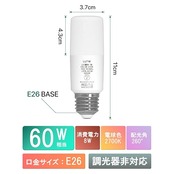 2019年度省エネ法(改正)目標基準値達成のt形タイプE26 LED電球です。 白熱電球のように広範囲に明るい広配光タイプで、リビング・ダイニング・キッチン・玄関・階段などの照明に最適。 密閉形器具に使用可能。断熱材施工器具には使用できません。 (※密閉形器具の種類によって、寸法が合わない、熱がこもる等の要因により、使用できなかったり、寿命が短くなる場合があります。) 調光(明るさを調節できる)機能のついた器具には使用できません。 ご注意(免責) ●取り付け・取り外しや清掃のときは、必ず電源を切ってください。感電の原因となります。●直流電源では絶対に使用しないでください。 ●破損したランプは使用しないでください。 ●電源を入れた状態や電源を切った後しばらくの間はランプが熱いので触れないでください。 商品仕様 ●商品サイズ(mm):高さ110mm 幅37mm ●口金サイズ: 26mm ●定格消費電力:8.0W ●全光束:810lm ●ランプ全体の明るさ:白熱電球60形相当 ●配光角:約260° ●定格寿命:約40000時間 ●電源:100V(50/60Hz共用) ●使用場所:室内用 ●密閉形器具:○