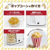 作り方簡単!市販のポップコーン豆を入れて約90秒待てば、出来立てのおいしいポップコーンの出来上がり!【STEP1】付属の計量スプーン1杯(約50g)のコーン(ポップコーン用)を入れます。【STEP2】電源をONにします。【STEP3】容器内でコーンがはじけて、約90秒待てば出来上がり♪