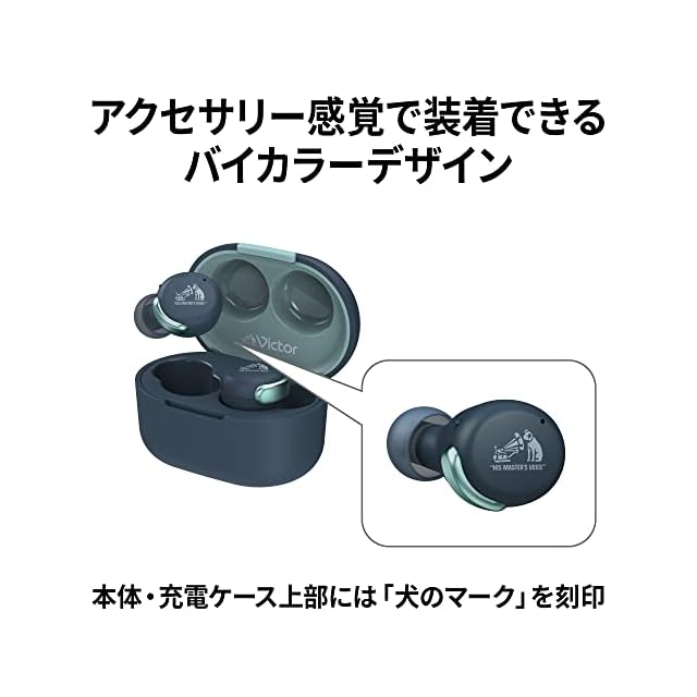 メタリックパーツをワンポイントに使ったミニマルなバイカラーデザインを採用。メタリックパーツは屋外使用時などで発生しやすい風切り音を抑制するフードとなり、機能面も考慮したデザインとなっています。イヤホン表面には、ビクターブランドのアイコン「ニッパー犬」のイラストもあしらいました。