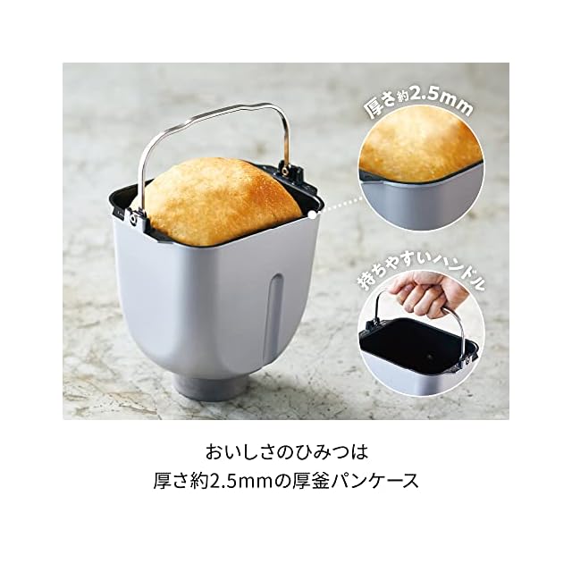 使いやすく、美しく。 機能的かつ洗練されたデザイン。 インテリアになじむシンプルなデザインと、おいしさと使い勝手のよさをとことん追求したホームベーカリー。 おいしくパンが焼けるように、厚さ約2.5mmの[厚釜パンケース]を独自に設計。 熱を十分に蓄え、安定した温度で一気にパンを焼き上げるので、"クラスト(パンの耳)は薄くカリっと、中はもっちり"とした食感が楽しめます。 12種類の厳選したメニューで、食パン(1斤サイズ)からアレンジパン、うどんやパスタなど麺類の生地、ピザ生地、おもちまで、幅広く作れます。 「予約(タイマー)機能」、「マナーモード」などの便利な機能も搭載。 写真入り[ガイドシート]付きなので、初心者でも失敗せずに安心してお使い頂けます。 ◆コンパクトでスリムな幅約20cm スペースの限られたキッチンでも置きやすいコンパクトサイズ。 インテリアになじむスッキリしたデザインで、出しっぱなしでも気になりません。 ◆おいしさのひみつは[厚釜パンケース]に! [コンパクトベーカリー]には、[厚釜パンケース]を採用。 ヒーターの熱を蓄え、パンケース全体に熱を行き渡らせることができます。 同時に外気温の影響も受けにくいので、温度も安定。 おいしくパンを焼き上げることができます。 ◆操作は簡単、欲しい機能はしっかり搭載 毎日使って欲しいから、操作はシンプルに。 焼き上がりを13時間先まで予約できる「タイマー機能」や、ブザー音や操作音が消せる「マナーモード」、稼働中の振動を抑えた設計など、便利な機能はしっかり搭載しました。 ◆52レシピ掲載!専用レシピブック付き 80ページの豪華な書籍仕様で、巻末には[グランド ハイアット 東京]提供のアレンジレシピも紹介されています。