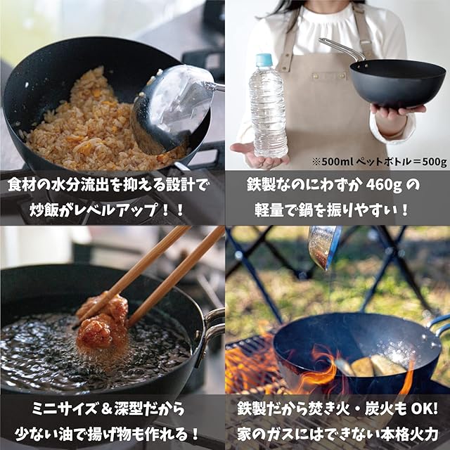 【鉄製なのに軽い】重さはわずか460g。500mlのペットボトル約1本分で、荷物が多くなりがちなキャンプにも持っていきやすい軽さです。