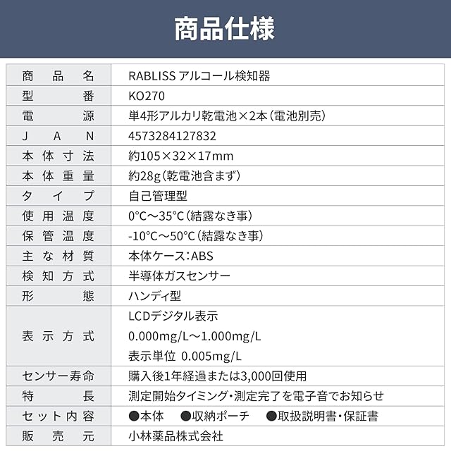 商品名:KO270【大手企業採用モデル】【国家公安委員会が定めるアルコール検知器】アルコールチェッカー アルコール濃度計 アルコール 濃度計 アルコールチェック お酒 アルコール検知器 高精度 ハンディ