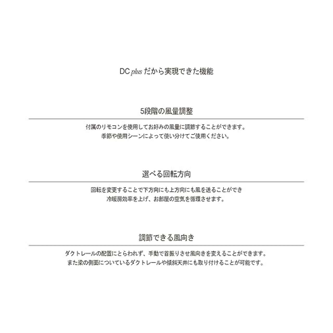 運転音 風量:1 13dB~風量:5 28dB Made in China ※天井直付けダクトレールではない場合、リモコンが反応しにくい場合がございます。 ※本製品はモーターが内蔵されているため、モーター特有の音が発生します。 ※簡易リモコンに関して:スマートな形のプロダクトな為、本体にON/OFFスイッチの搭載がございません。簡易リモコンでのON/OFFは、本体受光部に近づいての操作をお願いします。 ※調光機能付きの壁スイッチでの使用は出来ません。 ※羽根を取り付けの際は、羽根を留めているネジがしっかりと固定されている事を確認してください。