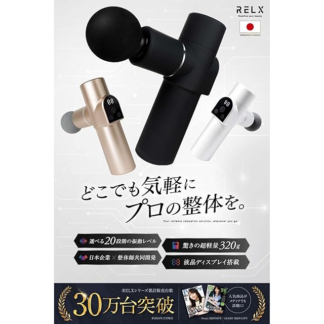 ✅【整体院長監修】 RELX(リラクス)TOTAL BODY CARE MINIはジムやゴルフなどの運動後や仕事終わりの疲れた足、肩・首などの気になる部位にプロの整体のような本格ボディケアをご体感いただけます。 【超軽量設計】老若男女どんな方にも使いやすいように本体はわずか320gと超軽量。手が小さい女性でも握りやすい形状、滑りにくい材質にこだわりました。