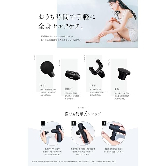 ✅【4種類のアタッチメント】 「球形」肩・二の腕・背中・腰・太もも・太もも裏など大きな筋肉に。 「円柱形」手のひら・足裏などピンポイントを刺激したいときに。 「U字形」腕・すね・足首など細めの筋肉に。 「平形」ふくらはぎをはじめ、あらゆる部位に。 【大容量バッテリー】 充電時間は約3.5時間で、約3〜4時間使用可能 ※本製品の使用頻度や使用レベルによって異なります。 ※バッテリーの寿命を保護するためにバッテリーが切れるまで充電しないでください。 ※USB-Cケーブルは必ず付属のケーブルをご使用ください。 ※製品の安全上、充電中はご使用いただけません。※初めての充電時や長期間使用しなかった場合、充電時間や使用時間が目安と大きく異る場合がありますが、通常何度か充電や使用を繰り返すと正常に戻ります 。※本製品到着時、本体は充電されておりませんので満充電してからご使用ください。