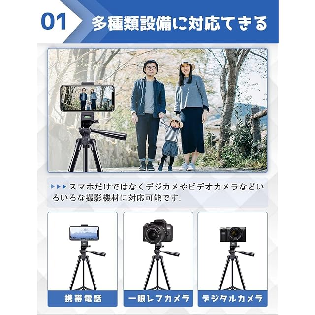 【3WAY雲台付き&多設備対応】この三脚は、スマホ、デジカメ、ビデオカメラ、一眼レフカメラなど、多様な機器に対応可能。付属のスマホホルダーは4.7インチから6.7インチまでのスマートフォンをしっかり固定。3WAY雲台は上下、左右、水平方向に自由に動かせ、360度調整可能で、自然な角度での撮影を実現します。雲台の操作性が高く、微妙な角度調整も簡単に行えるため、プロ級の写真や動画を撮影するのに最適です。さらに、さまざまな機器に対応するため、1台で多用途に使える便利さも特徴です。