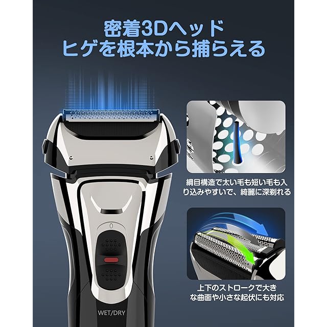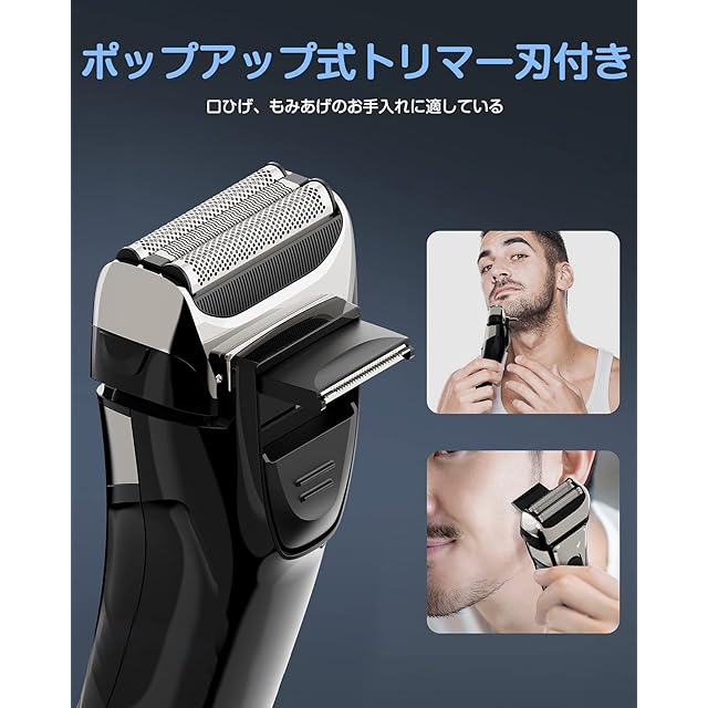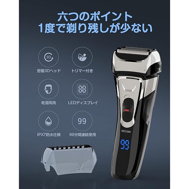 商品名:シェーバー メンズ 髭剃り 電動 電気シェーバー 往復式 ひげそり 3枚刃 メンズシェーバー 電気カミソリ ウェット&ドライ お風呂剃り可 IPX7防水 LEDディスプレイ トリマー付き 替刃付き 軽量 持ち運び便利 日本語説明書付き