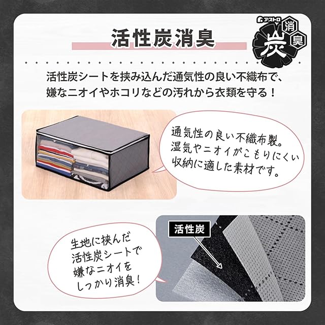 アストロ 活性炭消臭 衣類収納ケース グレー 活性炭のチカラで消臭保管 通気性の良い不織布製 ほこりや汚れから中身をガード 透明窓付き 蓋付き 積み重ね 衣類 洋服 収納袋 収納ボックス 衣装ケース クローゼット 押し入れ 171-71