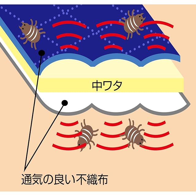 【吸湿繊維入りで防ダニ】:湿気を吸収する特殊繊維入りの中わたを挟み、湿度を下げることでダニの繁殖を抑制。