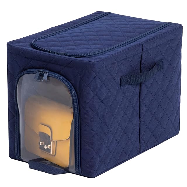 【商品仕様】:サイズ/約幅25×奥行40×高さ28cm、カラー/ネイビー、内容/1個、収納目安/薄手シャツなど:約20~24枚・セーターなど:約8~10枚、材質/ポリプロピレン・ポリエステル・合成繊維(アクリレート系)・ポリエチレン・鉄・厚紙
