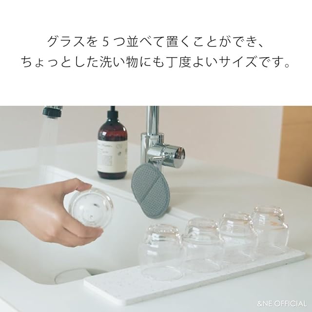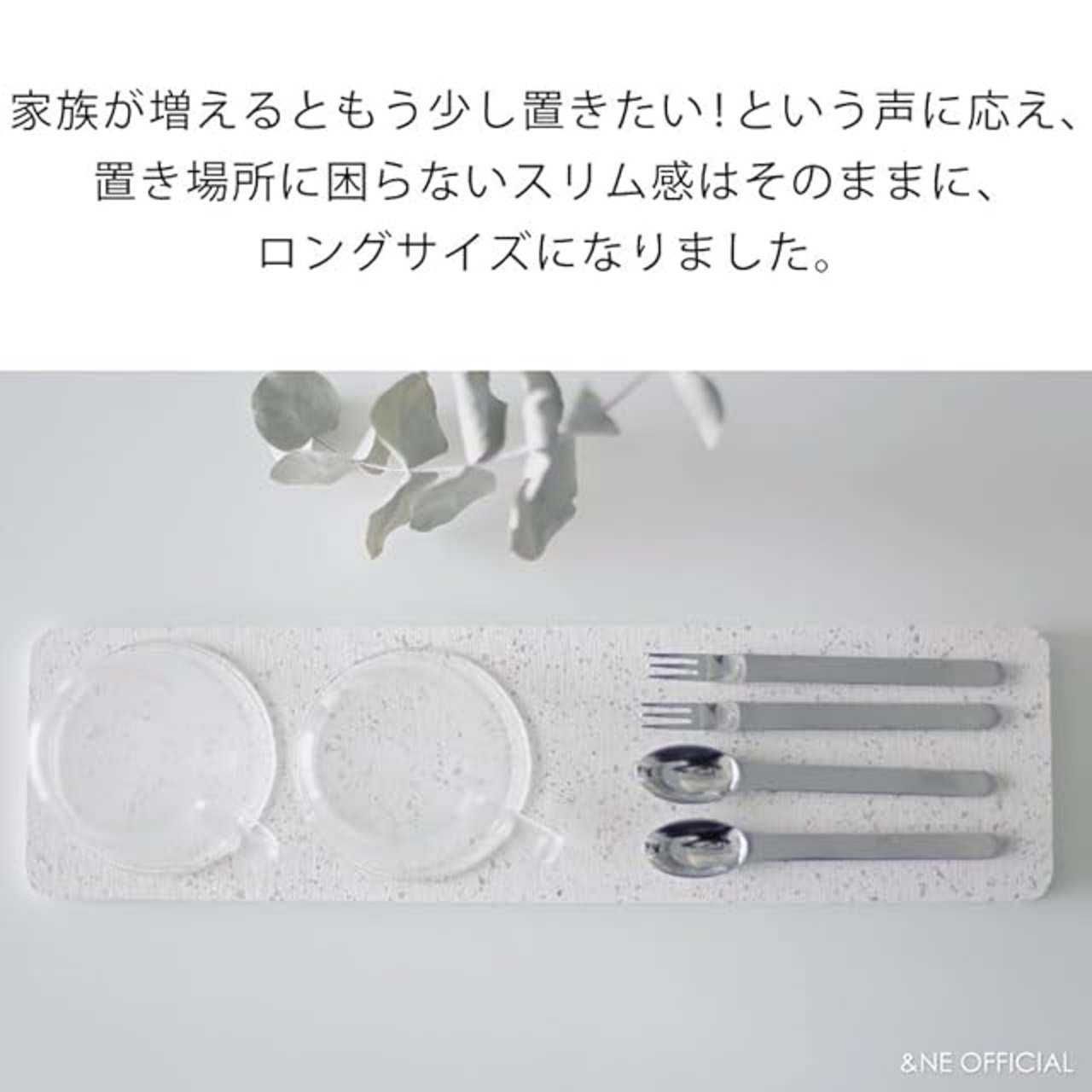 キッチンや洗面台まわりで大活躍のドライトレイに新サイズが登場。家族が増えるともう少し置きたい! という声に応え、置き場所に困らないスリム感はそのままに、ロングサイズになりました。グラスを5つ並べて置くことができ、ちょっとした洗い物にも丁度よいサイズです。