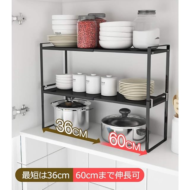 商品名:PASRLD シンク下収納 シンク上収納 伸縮式 約W36~60×D30×H20cm キッチンラック キッチン収納 伸縮収納棚 収納ラック ブラック