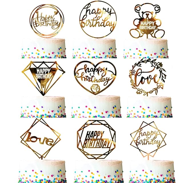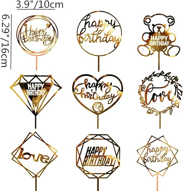 材質:アクリル サイズ:約10*16cm ゴールドのケーキトッパーがたくさんあります。アクリル製ケーキトッパーは再利用可能です。 誕生日ケーキをより可愛く華やかに飾ります。ウェディング、バレンタインや結婚式のケーキに使えるケーキトッパーも2種類入っています。 パッケージ:ケーキトッパー9個セット