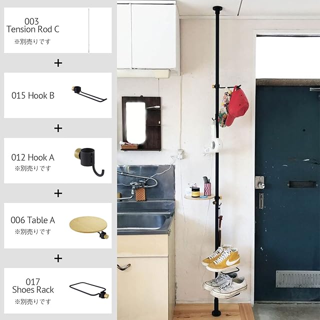 Tension Rod / Move Rodと組み合わせて使用できる、縦専用アクセサリーのフックです。ベースアイテムと同じスチール素材でマットな質感が統一され、より一本の線の存在感を引き立てます。
