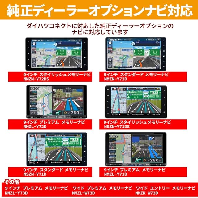 ※ご注文前にナビの型式を必ず確認して下さい。【対応車種・型式】 ●ダイハツ タント/タフト/ロッキー/トール 対応【対応ナビ】 純正ディーラーオプションナビ ・2023年モデル ◎9インチ プレミアム メモリーナビ ナビ型番:NMZL-Y73D (N259) 対応車種:ロッキー/トール 対応 ◎ワイド プレミアム メモリーナビ ナビ型番:NMZL-W73D(N261) 対応車種:タント/タフト/ロッキー/トール 対応 ◎ワイド エントリー メモリーナビ ナビ型番:NMZK-W73D(N263) 対応車種:タント/タフト/ロッキー/トール 対応
