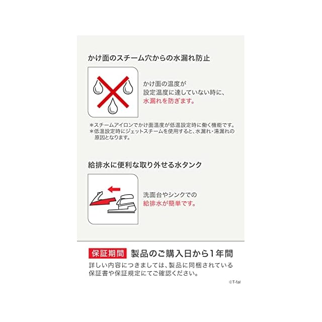 タンク内部の水滴について:本製品は工場出荷前にスチーム噴射検査を行っているため、水タンク内に水滴が残っている場合がございますが、製品のご使用には全く問題ございませんのでご安心ください。