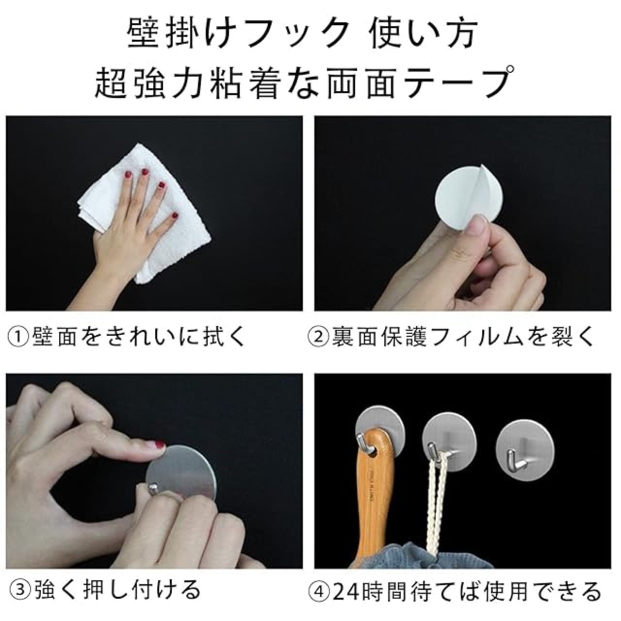 【錆びない、水に強い】高品質の304ステンレス鋼を使用しているため、この粘着フックは防水性と錆びにくさを備え、長い耐用年数があります。また、フックの角は滑らかで、衣類や手を傷つけることがありません。