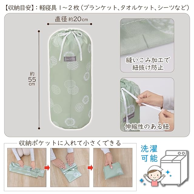 【商品仕様】:サイズ/約直径20×高さ55cm、カラー/グリーン、材質/ポリエステル、内容/1枚、収納目安/ダウンジャケットなら1枚・軽寝具(ブランケット・タオルケットなど)なら1~2枚