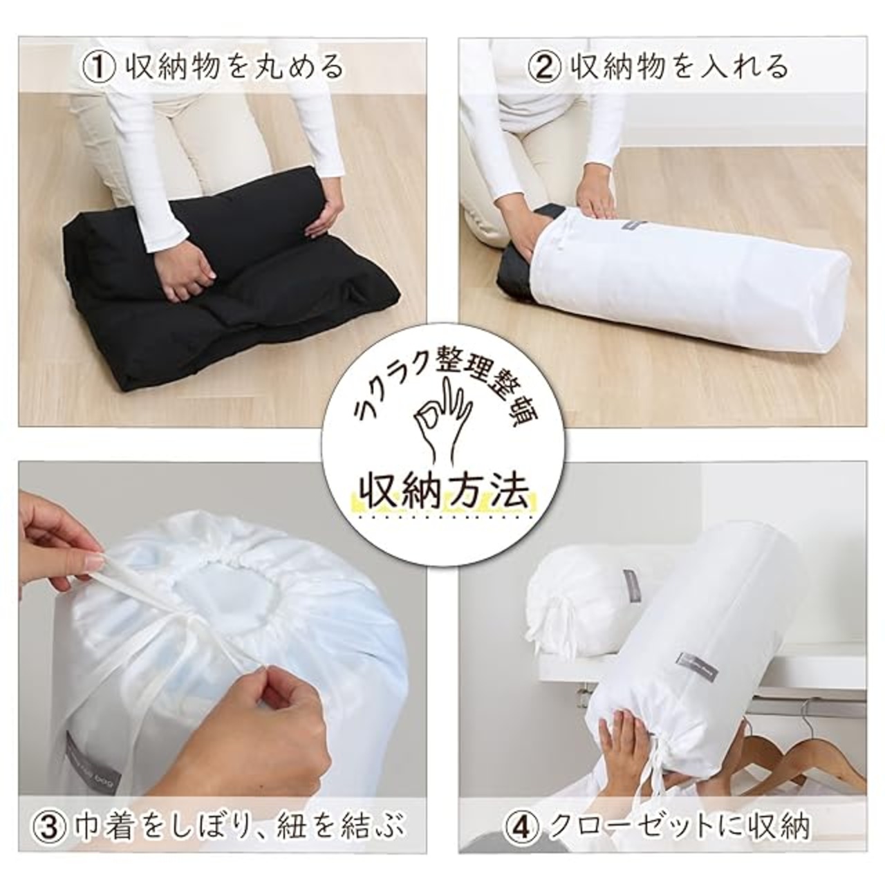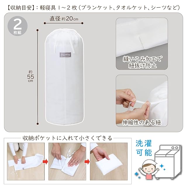 【商品仕様】:サイズ/約直径20×高さ55cm、カラー/ホワイト、材質/ポリエステル、内容/2枚、収納目安(1枚あたり)/ダウンジャケットなら1枚・軽寝具(ブランケット・タオルケットなど)なら1~2枚