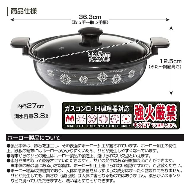 素材・材質:本体/ほうろう用鋼板、表面加工/ほうろう加工、メラミンフェノール樹脂、ハンドル/メラミンフェノール樹脂、フタ/全面物理強化ガラス