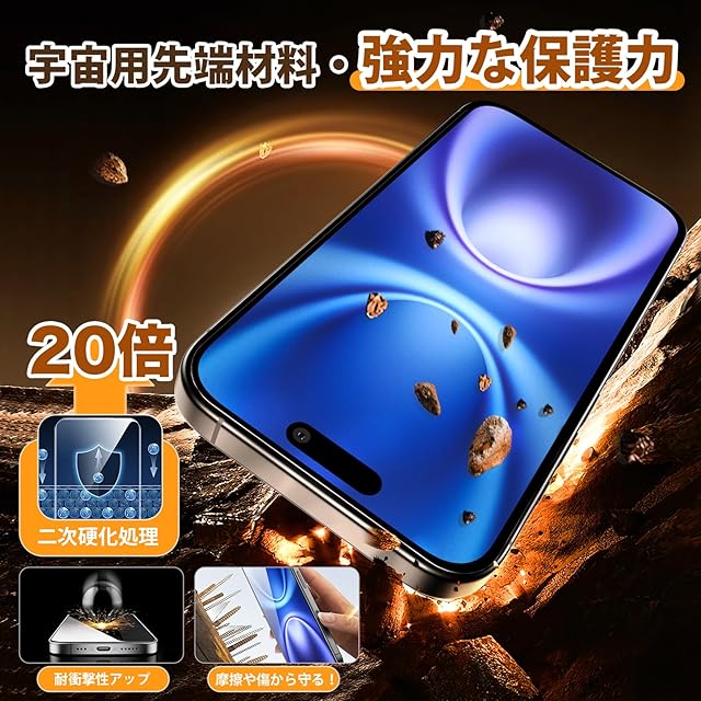 【強力な保護力】iPhone 16用ガラスフィルムには、日本製の高強度材料ガラスを採用し、表面硬度9Hに達します。一般的な熱強化処理を行った後に、6500°の二次硬化処理を行って、落下に対する耐性が非常に高いです。日本国内で累計10万枚以上販売されており、画面の破損記録はゼロです。