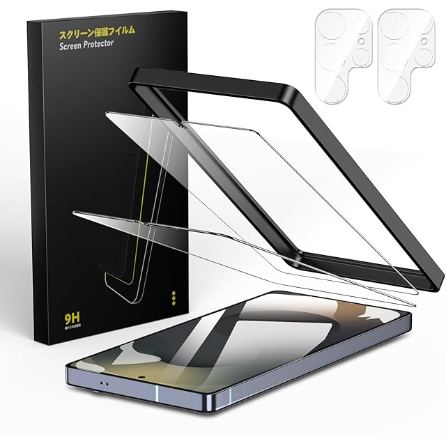 商品名:Besecou ガラスフィルム Galaxy S25 Ultra 用 2枚 + カメラフィルム 2枚 旭硝子素材製 ガイド枠付き 【指紋認証対応】強化ガラス 液晶保護 9H硬度 耐衝撃 気泡防止 高感度タッチ 指紋防止 防水撥油 飛散防止 ギャラクシーS25 Ultra 対応