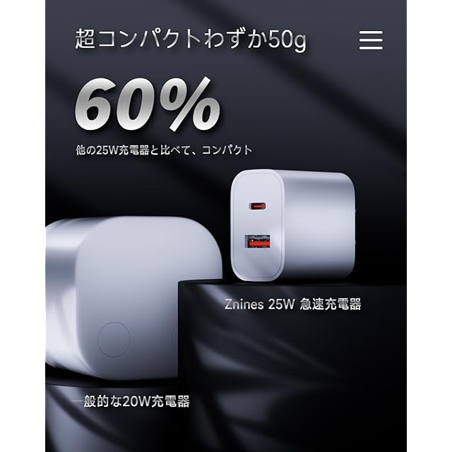 【業界では超軽量・超小型PD充電器】急速充電の対応機器を効率的に充電できます。type-c急速充電器で、25Wの急速充電が可能です。iPhone16は約60分で充電が完了し、通常の充電器の4倍の速さで充電できます。約2時間のフル充電後、MacBook Proは約1.5時間の充電が可能です。従来のtype-c充電器と比べ、約6倍の高速化を実現しています。わずか30分でiPhone16を0 ~ 60%充電できます。充電時間が40分以上短縮され、1日1時間以上の節約につながります。いつでもバッテリーがフル充電になり、充実した電力を実現します。