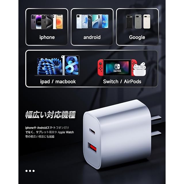 [高い安全性と幅広い適用性]type-c急速充電器は過充電、過熱、短絡防止システムを備え、PSE認証を取得しているので安心して使用できます。iPhoneシリーズやAndroidスマートフォン、タブレットなどさまざまな機種に対応しており、usb-aやtype-c対応機器では最大25Wまでフル充電が可能です。iphoneに適用される14/13分の1 / 12アイパッドair /ギャラクシーs22 / s21 android / switch /ノート20グーグル拡張/ sony xperiaなど各種設備。