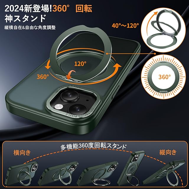 【多機能360度!縦も横も思いのまま!】:背面に搭載された嵌め込み式リングは、安定したアルミ合金製の円形スタンドを採用しており、従来のリングと比較して滑りにくく、安定したグリップを提供します。360°回転スタンド機能により、縦置き・横置きどちらの状態でも安定して利用でき、0°~ 120°の間で多角度自由に調整できます。動画視聴やFaceTimeを利用する際には、両手を解放し。外出先でも手軽に使用でき、リングやスタンドを持ち歩く必要がない。ケースを開けるだけでスタンドの完成!指にかければリングも便利に使用でき!ケースを閉じれば背面はスマートに平坦に。無限の使い方が可能で、機能性を重視する方にはぜひ手に取ってみてください!【 iphone 15 Plus 用 ケース アイフォン15Plus 用 ケース アイホン15プラス用ケース】