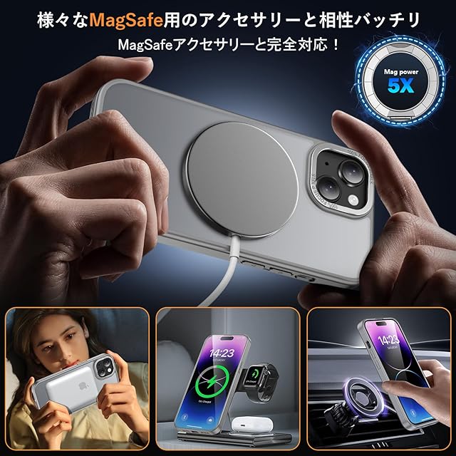【MagSafe対応・磁力アップグレード】:強力なN52磁石を搭載しており、磁石吸着力は従来より10倍高め、ケースを装着したまま高速ワイヤレス充電が可能です、充電時の熱を周囲に発散して。Magsafe充電がかつてないほど簡単にできます!強い磁力により車運転中の激しい振動でもMagsafe車載ホルダーから外れることなく、市販のあらゆるMagsafeアクセサリーに簡単対応!いくら振っても落ちないので、充電しながらゲームをやっても問題なし!【 iphone 15 Plus 用 ケース アイフォン15Plus 用 ケース アイホン15プラス用ケース】