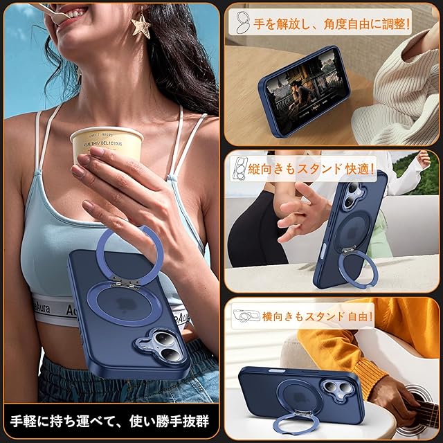 【多機能360度!縦も横も思いのまま!】:背面に搭載された嵌め込み式リングは、安定したアルミ合金製の円形スタンドを採用しており、従来のリングと比較して滑りにくく、安定したグリップを提供します。360°回転スタンド機能により、縦置き・横置きどちらの状態でも安定して利用でき、0°~ 120°の間で多角度自由に調整できます。動画視聴やFaceTimeを利用する際には、両手を解放し。外出先でも手軽に使用でき、リングやスタンドを持ち歩く必要がない。ケースを開けるだけでスタンドの完成!指にかければリングも便利に使用でき!ケースを閉じれば背面はスマートに平坦に。無限の使い方が可能で、機能性を重視する方にはぜひ手に取ってみてください!【iPhone 17 用 ケース あいふぉん 17 用 ケース アイホン 17 用ケース】