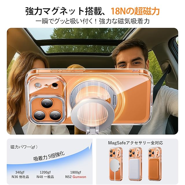 【MagSafe対応・磁力アップグレード】:強力なN52磁石を搭載しており、磁石吸着力は従来より10倍高め、ケースを装着したまま高速ワイヤレス充電が可能です、充電時の熱を周囲に発散して。Magsafe充電がかつてないほど簡単にできます!強い磁力により車運転中の激しい振動でもMagsafe車載ホルダーから外れることなく、市販のあらゆるMagsafeアクセサリーに簡単対応!いくら振っても落ちないので、充電しながらゲームをやっても問題なし!【iPhone 17 Pro Max 用 ケース あいふぉん 17 Pro Max 用 ケース アイホン 17 プロ マクス 用ケース】