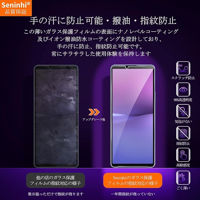 【Seninhi】 Sony Xperia 10 V 強化ガラス 保護フィルム について 仕様 厚さ: 0.26mm 光透過率: 99% 素材:日本AGC旭硝子ガラス 対応機種:Sony Xperia 10 V 【同梱品】 2 × 強化ガラスフィルム 2 × レンズ保護フィルム 1 × 取扱説明書 2 × アルコールペーパータオル 2 × ホコリ除去用ステッカー 特徴 【9h高硬度】 私たちの強化フィルムは日本AGC旭硝子ガラスを使用し、4.5時間の高温急冷と多 重強化処理して、同じ厚さの通常のガラスフィルムに比べて約5倍の強さを持ち、 ガラスフィルムは9Hの最も硬い表面硬度に達しました。ナイフなどの鋭いものでも 傷を与えません。日常生活で気軽に対応できます。 【飛散防止】 飛散防止を通して、万が一ガラスが割れても破片が飛散しなく、破片による重傷事 故を減らして、とても安全です。 【高感度タッチ】 この強化フィルムは0.26mmのゴールデン厚さを設計しており、防爆する同時に、 感度が高いタッチ体験と連続タッチを確保し、高感度でスムーズなオンスクリーン 操作を実現し、ガラスフィルムを取り付けない画面とほぼ同じような使用体験を与えます。 高感度でスムーズなオンスクリーン操作は様々なゲーム アプリケーションに適 用します。 【99%以上の携帯電話ケースに干渉しない】 百件以上な携帯電話ケースをテストしましたが、適応率は 99%に達しました。高品質 の接着剤を使用したので、携帯電話ケースに取り付けられている瞬間保護フィル ムがわずかに浮き、軽く押すと気泡がきれいに消えます。 【素人でも簡単に貼り付け】 ガラスフィルムの取扱説明書に張り付ける方法は詳しく記載したので、位置をよく 合わせた後、上から軽く貼り付けると、シリコン吸着層が自動的に吸着し、気泡が 発生しません。誰でも簡単に貼り付けられ、万が一失敗しても剥がして貼り直すことができます。 三、ご注意事項: 1.フィルムを貼り付ける前に、手をきれいに洗ってください。 2.泡があれば、クロスを指に巻きつけて少しずつ絞りだしてください。 3.貼り直しによる泡を防止するため、はがす際にフィルムの粘着面に手や物が触れないようご注意ください。 4. 保護フィルムは過度の衝撃等を防止するものではありません。携帯電話の故障、紛失等の責任は負いかねます。 四、アフターサービス ご購入日より180日以内に初期不良や、ヒビ・欠け・ホコリ混入・サイズ違い等の使用上の問題がございましたら、 ご遠慮なく、いつでもお気軽にご連絡ください。私たちは具体的な問題により、お客様に満足できる解決策を提供します。 【ご注意】商品はガラス製のため、貼り付け後の落下による破損は外となります。