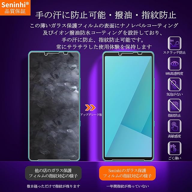 <b>【Seninhi】 Xperia 10 VII 強化ガラス 保護フィルム について</b> <br> <br><b>仕様 </b><br>厚さ: 0.26mm <br>光透過率: 99% <br>素材:日本AGC旭硝子ガラス <br>対応機種: Xperia 10 VII<br><br><b>【同梱品】</b> <br>2 × 強化ガラスフィルム <br>2 × レンズ保護フィルム <br>1 × 取扱説明書 <br>2 × アルコールペーパータオル <br>2 × ホコリ除去用ステッカー <br> <br><b>特徴</b> <br><b>【9h高硬度】</b> <br>私たちの強化フィルムは日本AGC旭硝子ガラスを使用し、4.5時間の高温急冷と多<br>重強化処理して、同じ厚さの通常のガラスフィルムに比べて約5倍の強さを持ち、<br>ガラスフィルムは9Hの最も硬い表面硬度に達しました。ナイフなどの鋭いものでも<br>傷を与えません。日常生活で気軽に対応できます。 <br> <br><b>【飛散防止】</b> <br>飛散防止を通して、万が一ガラスが割れても破片が飛散しなく、破片による重傷事<br>故を減らして、とても安全です。 <br> <br><b>【高感度タッチ】</b> <br>この強化フィルムは0.26mmのゴールデン厚さを設計しており、防爆する同時に、<br>感度が高いタッチ体験と連続タッチを確保し、高感度でスムーズなオンスクリーン<br>操作を実現し、ガラスフィルムを取り付けない画面とほぼ同じような使用体験を与えます。<br>高感度でスムーズなオンスクリーン操作は様々なゲーム アプリケーションに適<br>用します。 <br> <br><b>【99%以上の携帯電話ケースに干渉しない】</b> <br>百件以上な携帯電話ケースをテストしましたが、適応率は 99%に達しました。高品質<br>の接着剤を使用したので、携帯電話ケースに取り付けられている瞬間保護フィル<br>ムがわずかに浮き、軽く押すと気泡がきれいに消えます。 <br> <br><b>【素人でも簡単に貼り付け】</b> <br>ガラスフィルムの取扱説明書に張り付ける方法は詳しく記載したので、位置をよく<br>合わせた後、上から軽く貼り付けると、シリコン吸着層が自動的に吸着し、気泡が<br>発生しません。誰でも簡単に貼り付けられ、万が一失敗しても剥がして貼り直すことができます。 <br><br><b>三、ご注意事項:</b> <br>1.フィルムを貼り付ける前に、手をきれいに洗ってください。 <br>2.泡があれば、クロスを指に巻きつけて少しずつ絞りだしてください。 <br>3.貼り直しによる泡を防止するため、はがす際にフィルムの粘着面に手や物が触れないようご注意ください。 <br>4. 保護フィルムは過度の衝撃等を防止するものではありません。携帯電話の故障、紛失等の責任は負いかねます。 <br><br><b>四、アフターサービス</b> <br>ご購入日より180日以内に初期不良や、ヒビ・欠け・ホコリ混入・サイズ違い等の使用上の問題がございましたら、<br>ご遠慮なく、いつでもお気軽にご連絡ください。私たちは具体的な問題により、お客様に満足できる解決策を提供します。 <br><br><b>【ご注意】商品はガラス製のため、貼り付け後の落下による破損は外となります。</b>