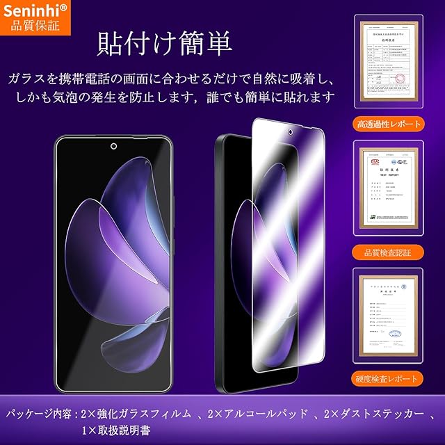 <b>【Seninhi品質を重視する】</b><br> 対応機種:OPPO Reno13 A 強化ガラス 保護フィルム <br> <br><b> 仕様</b><br> 厚さ: 0.3mm <br>光透過率: 99% <br>素材:国産AGC旭硝子ガラス <br><b><br>【同梱品】</b><br> 2 × 強化ガラスフィルム <br>2 × レンズ保護フィルム <br>1 × 取扱説明書 <br>2 × スクリーンクリーニングキット <br>2 × ホコリ除去用ステッカー <br><br><b>【9h高硬度】</b><br> 私たちの強化フィルムは 国産AGC旭硝子ガラスを使用し、4.5時間の高温急冷と多重強化処理して、同じ厚さの通常のガラスフィルムに比べて約5倍の強さを持ち、<br> ガラスフィルムは9Hの最も硬い表面硬度に達しました。ナイフなどの鋭いものでも傷を与えません。日常生活で気軽に対応できます。<br><br><b> 【飛散防止】</b><br> 飛散防止を通して、万が一ガラスが割れても破片が飛散しなく、破片による重傷事故を減らして、とても安全です。 <br><br><b>【高感度タッチ】</b><br> この強化フィルムは0.3mmのゴールデン厚さを設計しており、防爆する同時に、感度が高いタッチ体験と連続タッチを確保し、高感度でスムーズなオンスクリーン操作を実現し、<br> ガラスフィルムを取り付けない画面とほぼ同じような使用体験を与えます。高感度でスムーズなオンスクリーン操作は様々なゲーム アプリケーションに適用します。<br><br><b> 【99%以上の携帯電話ケースに干渉しない】</b><br> 百件以上な携帯電話ケースをテストしましたが、適応率は 99%に達しました。高品質の接着剤を使用したので、<br> 携帯電話ケースに取り付けられている瞬間保護フィルムがわずかに浮き、軽く押すと気泡がきれいに消えます。<br><br><b> 【素人でも簡単に貼り付け】</b><br> ガラスフィルムの取扱説明書に張り付ける方法は詳しく記載したので、位置をよく合わせた後、上から軽く貼り付けると、シリコン吸着層が自動的に吸着し、<br> 気泡が発生しません。誰でも簡単に貼り付けられ、万が一失敗しても剥がして貼り直すことができます。<br><br><b> ご注意事項:</b><br> 1.フィルムを貼り付ける前に、手をきれいに洗ってください。<br> 2.泡があれば、クロスを指に巻きつけて少しずつ絞りだしてください。 <br>3.貼り直しによる泡を防止するため、はがす際にフィルムの粘着面に手や物が触れないようご注意ください。<br> 4. 保護フィルムは過度の衝撃等を防止するものではありません。携帯電話の故障、紛失等の責任は負いかねます。 <br><br>アフターサービス ご購入日より180日以内に初期不良や、ヒビ・欠け・ホコリ混入・サイズ違い等の使用上の問題がございましたら、<br>ご遠慮なく、いつでもお気軽にご連絡ください。私たちは具体的な問題により、お客様に満足できる解決策を提供します。
