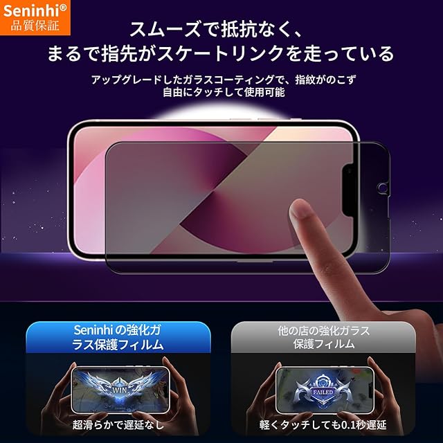 【専用設計】iPhone 13 専用に設計した保護フィルムなので、必ずご購入前にお使いの携帯電話の機種をご確認ください。(お買い得な4点セット)液晶保護フィルム*2枚+レンズ保護フィルム*2枚+ガイド枠*1枚の組み合わせ、1度のご購入で、携帯電話の保護フィルムとカメラ保護フィルムが入っております。【正規品】Seninhi ブランドは 10 年間携帯電話保護フィルムの製造しており、最高品質の保護フィルムを生産することを約束します。市販の高価な保護フィルムと同じですが、価格がもっと安いので、お客様に大変ご愛顧いただき、月間販売数は20,000枚を超えました。弊社の製品は購入価値があります。安心して当社の製品をお買い求めください。
