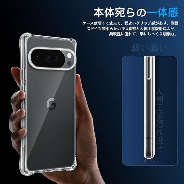 <b>★【製品仕様】</b><br>対応機種:google Pixel 10 Pro XL 用クリアケース<br>透明度や衝撃保護に優れて、薄さと強度のバランスを取り、日常の使い心地よい、細部まで追求したクリアケース。<br><b>★【抜群な耐衝擊性】</b><br>いくら気をつけていても落とす時がある!でも大丈夫!厳密なテストにより、グーグルピクセル10プロ XLが全面的に保護されることを実証しました。<br>2Mの高さから26回以上落としても本体は綺麗に無傷!また、四隅には高耐震クッションを搭載しており、高い耐衝撃性を誇り、pixel10ProXLを全方位からしっかりと守ります。<br><b>★【超高透過率&黄変防止】</b><br>99%に持ち上げた透明感が本体の美しさをそのまま、本体の崇高な美しさと高級感を損なわなく。<br>ドイツ製バイエルTPU素材や高品質採用、スマホケースの黄変を効果的に防ぐことができます。<br><b>★【指紋防止&撥水撥油】</b><br>ケースには撥油コーティングが施されており、指紋や汚れなどに強くなめらかな操作感を実現、付着した汚れなどは簡単に拭きとれます。<br>背面に水紋を防ぐため、バックと本体の間に小さいドットを配置し、水紋を有効防止!<br><b>★【ワイヤレス充電対応】</b><br>ケースを付けたままでワイヤレス充電OK可能です。背面は放熱性良いポリカーボネート素材を使い、効果的に熱を放散し、バッテリーにも優しいです。<br>また、コネクタに干渉しにくい設計で、ケースをつけたままコネクタへの接続が可能です。<br><b>★【絶妙バランス・快適操作】</b><br>クリアケースの保護性能を保ちながら、スマートさを損なわないよう、このケースは薄さと強度のバランスを取り、手にフィットする程よい厚みで、<br>快適さが保ち、ボタンも押しやすく、最適な設計で作り出す。加工精度はピッタリ!スイッチ類、カメラ位置も含めて寸法はバッチリです!<br><b>★【取り付け簡単】</b><br>簡単に脱着する方法:スマホを横向きに左手で持ち。右手の親指でgoogle Pixel 10 Pro XLカメラの部分を上に押しながら、右手の差し指でスマホケース右上の角を下に押し出してケースを外す。<br><b>★【安心】</b><br>こちらの google Pixel 10 Pro XL 用クリア カバーには180日間の安心ながあります。<br>お客様にお届け前に検査スタッフが1個づつ品質チェックしておりますが、ご使用前に万が一、不良品がお手元に届いた場合は返金、交換、返品等の対応を取らせて頂きますので、安心してご注文ください。