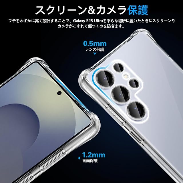 <b>★【製品仕様】</b><br>対応機種:Galaxy S25 Ultra 用クリアケース<br>透明度や衝撃保護に優れて、薄さと強度のバランスを取り、日常の使い心地よい、細部まで追求したクリアケース。<br><b>★【抜群な耐衝擊性】</b><br>いくら気をつけていても落とす時がある!でも大丈夫!厳密なテストにより、ギャラクシーS25 Ultraが全面的に保護されることを実証しました。<br>2Mの高さから26回以上落としても本体は綺麗に無傷!また、四隅には高耐震クッションを搭載しており、高い耐衝撃性を誇り、ギャラクシー S25 Ultraを全方位からしっかりと守ります。<br><b>★【超高透過率&黄変防止】</b><br>99%に持ち上げた透明感が本体の美しさをそのまま、本体の崇高な美しさと高級感を損なわなく。<br>ドイツ製バイエルTPU素材や高品質のPC素材を採用、スマホケースの黄変を効果的に防ぐことができます。<br><b>★【指紋防止&撥水撥油】</b><br>ケースには撥油コーティングが施されており、指紋や汚れなどに強くなめらかな操作感を実現、付着した汚れなどは簡単に拭きとれます。<br>背面に水紋を防ぐため、バックと本体の間に小さいドットを配置し、水紋を有効防止!<br><b>★【ワイヤレス充電対応】</b><br>ケースを付けたままでワイヤレス充電OK可能です。背面は放熱性良いポリカーボネート素材を使い、効果的に熱を放散し、バッテリーにも優しいです。<br>また、コネクタに干渉しにくい設計で、ケースをつけたままコネクタへの接続が可能です。<br><b>★【絶妙バランス・快適操作】</b><br>クリアケースの保護性能を保ちながら、スマートさを損なわないよう、このケースは薄さと強度のバランスを取り、手にフィットする程よい厚みで、<br>快適さが保ち、ボタンも押しやすく、最適な設計で作り出す。加工精度はピッタリ!スイッチ類、カメラ位置も含めて寸法はバッチリです!<br><b>★【取り付け簡単】</b><br>簡単に脱着する方法:スマホを横向きに左手で持ち。右手の親指でGalaxy S25 Ultraカメラの部分を上に押しながら、右手の差し指でスマホケース右上の角を下に押し出してケースを外す。<br><b>★【安心】</b><br>こちらの ギャラクシーS25 ウルトラ 用クリア カバーには180日間の安心ながあります。<br>お客様にお届け前に検査スタッフが1個づつ品質チェックしておりますが、ご使用前に万が一、不良品がお手元に届いた場合は返金、交換、返品等の対応を取らせて頂きますので、安心してご注文ください。