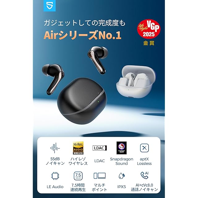 ※1「PeatsAudio」アプリにてマルチポイント機能をオフにすると、LDACコーデックをご利用いただけます。 ※2 マルチポイント接続時にLDACは利用できません。【至高のオーディオ体験は次のステージへ~LDAC※/aptX Losslessに両対応】※1「PeatsAudio」アプリにてマルチポイント機能をオフにすると、LDACコーデックをご利用いただけます。 ※2 マルチポイント接続時にLDACは利用できません。SOUNDPEATS Air5 Pro 完全ワイヤレスイヤホン は、Qualcommの最新世代チップ「QCC3091」を採用、最大96kHz/24bitのハイレゾワイヤレス再生が可能なLDACとaptX Adaptive、そしてCD品質のオーディオデータを損失なく伝送できるaptX Losslessに対応しました。楽曲の細部までクリアに再現し、スタジオクオリティのサウンドをお楽しみいただけます。さらに、環境に応じて最適なコーデックを自分で選択できるため、ワイヤレスでも妥協のない音楽体験を実現。音の違いにこだわるあなたへ、至高のオーディオ体験をお届けします!<br/> 【SOUNDPEATSならではの高音質~ポケットに収まる高音質ガジェット】ワイヤレスイヤホン Air5 Proは、10mm径ダイナミックドライバーを搭載。振動板には、耐熱性・強度に優れ、内部損失性にも長けたポリエーテルエーテルケトン(PEEK)とポリウレタン(PU)の複合素材を採用しました。さらに、SOUNDPEATSのノウハウを活かしたアコースティック設計と調整を施すことで、低音から高音までバランスの取れた歪みの少ないクリアな音を実現しました。また、高性能なダイナミックドライバーと高音質コーデック「LDAC」※/「aptX Lossless」を組み合わせることで、クリアで透明感あふれるサウンドを実現。コストパフォーマンスを意識しつつもクオリティには妥協しない、SOUNDPEATSならではの「パワフル&ダイナミックサウンド」をぜひ体感してください。※「PeatsAudio」アプリでマルチポイント機能をオフにすると、LDACコーデックをご利用いただけます。<br/> 【SOUNDPEATS史上最強ノイズキャンセリング!AI 適応型(アダプティブ)ANC】周囲の状況に応じてノイズ低減レベルが変動するAI適応型(アダプティブ)ノイズキャンセリングを搭載し、最大55dB のノイズ低減を実現します。これまでにない圧倒的な静寂を提供し、雑音に邪魔されることなく音楽に集中できます。アプリ「PeatsAudio」を使用すれば、ノイズキャンセリングのモードをシーンに合わせて自由に調整可能。カフェや電車内、飛行機など、あらゆる環境で最適な静寂空間を実現できます。外音取り込み機能も備えており、イヤホンを外さずに駅のアナウンスや周囲の声を瞬時にキャッチ。ゲームや音楽を楽しみながらも、必要な音はしっかりと聞き取れるため、日常生活でも快適にご使用いただけます。<br/> 【バッテリー切れの心配なし!最大37時間再生可能&急速充電対応】イヤホン単体で7.5時間の連続再生が可能※。充電ケースを併用すれば合計37時間もの長時間バッテリーライフを実現します。さらに、急速充電に対応しており、わずか10分の充電で2時間の再生が可能です。長時間の音楽鑑賞はもちろん、外出先での急なバッテリー切れの心配もこれで解決。快適なサウンド体験を、どこでも存分にお楽しみいただけます。また、イヤホンはIPX5の防水性能を備えており、アウトドアやスポーツシーンでも安心してご利用いただける快適な音楽体験をお届けします!※(AACコーデック、音量60%、通常モード、ANC OFFで測定)再生時間は音楽再生時の時間であり、音量、再生内容、使用環境によって異なる場合があります。<br/> 【音の可能性を無限に広げよう~専用アプリ「PeatsAudio」】専用アプリ「PeatsAudio」では、イコライザーやタッチボタン設定に加え、ファームウェアアップデートでイヤホンを最新の状態に保つことができます。また、新機能の「ノイズキャンセリングモード」や「外部音取り込みモード」を導入しました。シーンやニーズに合わせてモードを自由に調整可能です。カフェや電車内、飛行機など、あらゆる環境で心地よい静寂を手に入れられます。<br/> 【マルチポイント接続】Bluetoothのマルチポイント接続に対応、1台のAir5 Proワイヤレスイヤホンを2台のPC/スマートフォンと同時接続できます。PCで音楽を聞いたり、ビデオ会議の最中にスマホにかかってきた着信へ応答することも簡単です。※マルチポイント接続時にLDACは利用できません。<br/> 【世界とのつながり方を再び変える~LE AudioとLC3コーデックに対応】Bluetoothオーディオの新しい標準規格「LE-Audio」に対応します※。革新的なLC3コーデックを採用しており、低データレートでも高音質を実現可能です。※1アプリ「PeatsAudio」でLE Audioをオンにする必要があります。※2ご注意:LE AudioとLC3コーデック接続をご利用の場合、アプリ「PeatsAudio」との接続が正常に行われない可能性がございますので、予めご了承ください。
