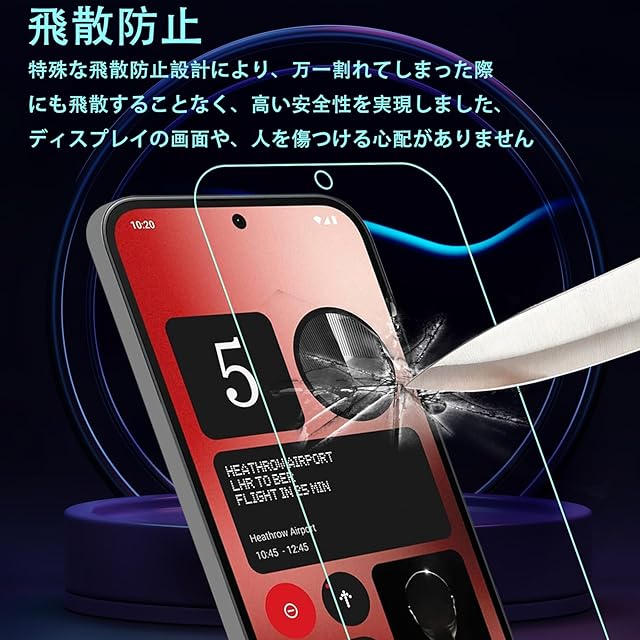 【対応機種】FOR Nothing Phone (2a) 用のフィルム 強化ガラス 液晶保護フィルム。注: 同じ機種です。メーカーが提供するカメラの穴の開口部は異なる開口部がある場合があります、ご理解ください。モデルによってサイズが異なりますので、モデルを確認してご購入ください。<br> 【表面硬度9H】カッターなどの鋭利なものを当たってもキズが付きにくくて高い強度を持ち表面硬度9Hが特徴です。ハードコーティング技術は、衝撃を最小限に抑えて画面の破損を抑え、すり傷防止や指紋防止もしっかりとスクリーンを保護します。本体の端を完全に覆い、液晶画面を保護します。エッジの衝撃が軽減され、ガラス膜の耐久性も向上しました。万が一の破損時も飛散防止加工によって破片はフィルムに張り付いた状態で破片がほとんど飛び散らない安全性の高いガラスになっています。<br> 【0.33mmの極薄ガラス採用&2.5D ラウンドエッジ仕様】透過率は約99%に達し高い透明度は、元の画面の明るさ、アンチグレア、高感度タッチ、鮮明な画像、立体感を強調し、視覚効果を向上させ。 画質も傷つきにくいです。見た目・触り心地ともに何も付けてない状態と殆ど変わりません。厚さ0.33mmの超極薄で、何も貼っていないような感じで液晶画面の美しさをお楽しみいただけます。指紋ロック解除技術をサポートし、迅速なアプリケーション起動、スムーズなゲーム体験とビデオ再生をします。気泡が入りにくいのできれいに貼り付けられる。2.5D ラウンドエッジ加工など、使いやすさにもこだわりました。 飛散防止加工、粉々に散らばらないので、ディスプレイの画面や、人を傷つける心配がありません<br> 【汚れ防止&飛散防止】指紋防止加工、耐オイルコーティングで表面がいつもきれい、油分、指紋や汚れが付きにくいです。また付着した水滴や汗、など簡単に拭き取れるだけでなく、指の滑り感も優れています。とても滑らかで、触り心地はとても良いのです。特殊な飛散防止設計により、万一割れてしまった際にも飛散することなく、高い安全性を実現しました、ディスプレイの画面や、人を傷つける心配がありません<br> 【貼り付けは簡単です】気泡が入りにくく、初心者でも完璧に貼り付けられます、角を合わせてポンと中心を押すだけで貼りつけ完了、自己吸着機能!気泡が発生しにくいので、綺麗に貼り付けられます。 撥油コーティング加工されているため、耐油性に優れ、指紋付きにくく、付着した汚れも簡単に拭き取れます。液晶画面の発色を損なうことはなく、精確なタッチ感、スライドしても引っかかり感がなく、さらさら手さわり、裸さながらの質感を実現します。画面上の操作も違和感なくスムーズに行えます。<br>