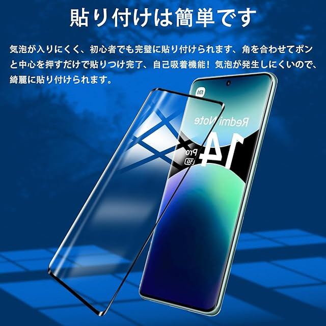 【対応機種】FOR Redmi Note 14 Pro 5G 用のフィルム 強化ガラス 液晶保護フィルム。注: 同じ機種です。メーカーが提供するカメラの穴の開口部は異なる開口部がある場合があります、ご理解ください。モデルによってサイズが異なりますので、モデルを確認してご購入ください。<br> 【表面硬度9H】カッターなどの鋭利なものを当たってもキズが付きにくくて高い強度を持ち表面硬度9Hが特徴です。ハードコーティング技術は、衝撃を最小限に抑えて画面の破損を抑え、すり傷防止や指紋防止もしっかりとスクリーンを保護します。本体の端を完全に覆い、液晶画面を保護します。エッジの衝撃が軽減され、ガラス膜の耐久性も向上しました。万が一の破損時も飛散防止加工によって破片はフィルムに張り付いた状態で破片がほとんど飛び散らない安全性の高いガラスになっています。<br> 【0.33mmの極薄ガラス採用&2.5D ラウンドエッジ仕様】透過率は約99%に達し高い透明度は、元の画面の明るさ、アンチグレア、高感度タッチ、鮮明な画像、立体感を強調し、視覚効果を向上させ。 画質も傷つきにくいです。見た目・触り心地ともに何も付けてない状態と殆ど変わりません。厚さ0.33mmの超極薄で、何も貼っていないような感じで液晶画面の美しさをお楽しみいただけます。指紋ロック解除技術をサポートし、迅速なアプリケーション起動、スムーズなゲーム体験とビデオ再生をします。気泡が入りにくいのできれいに貼り付けられる。2.5D ラウンドエッジ加工など、使いやすさにもこだわりました。 飛散防止加工、粉々に散らばらないので、ディスプレイの画面や、人を傷つける心配がありません<br> 【汚れ防止&飛散防止】指紋防止加工、耐オイルコーティングで表面がいつもきれい、油分、指紋や汚れが付きにくいです。また付着した水滴や汗、など簡単に拭き取れるだけでなく、指の滑り感も優れています。とても滑らかで、触り心地はとても良いのです。特殊な飛散防止設計により、万一割れてしまった際にも飛散することなく、高い安全性を実現しました、ディスプレイの画面や、人を傷つける心配がありません<br> 【貼り付けは簡単です】気泡が入りにくく、初心者でも完璧に貼り付けられます、角を合わせてポンと中心を押すだけで貼りつけ完了、自己吸着機能!気泡が発生しにくいので、綺麗に貼り付けられます。 撥油コーティング加工されているため、耐油性に優れ、指紋付きにくく、付着した汚れも簡単に拭き取れます。液晶画面の発色を損なうことはなく、精確なタッチ感、スライドしても引っかかり感がなく、さらさら手さわり、裸さながらの質感を実現します。画面上の操作も違和感なくスムーズに行えます。<br>