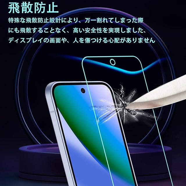 【表面硬度9H】カッターなどの鋭利なものを当たってもキズが付きにくくて高い強度を持ち表面硬度9Hが特徴です。ハードコーティング技術は、衝撃を最小限に抑えて画面の破損を抑え、すり傷防止や指紋防止もしっかりとスクリーンを保護します。本体の端を完全に覆い、液晶画面を保護します。エッジの衝撃が軽減され、ガラス膜の耐久性も向上しました。万が一の破損時も飛散防止加工によって破片はフィルムに張り付いた状態で破片がほとんど飛び散らない安全性の高いガラスになっています専用の 対応 Google Pixel 10 ガラスフィルム Google Pixel 10 ガラスフィルム 専用の保護フィルム 。